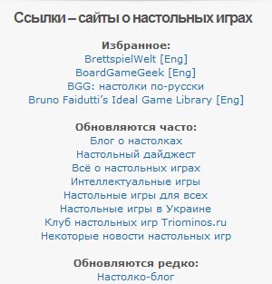 Почти три месяца назад некто Hargrim Csorcon предложил мне упорядочить список ссылок на сайте (тот самый, что вы можете видеть на панели справа). Предложение это вполне здравое. Всё-таки, когда я только создал свой сайт ссылок на нём было всего-ничего. Потом но постепенно стали появляться новые проекты, посвящённые настолкам, и я их прилежно заносил в раздел "Ссылки". И в результате раздел этот разросся непомерно и ориентироваться в нём стало непросто.