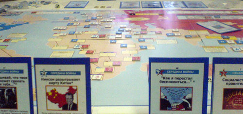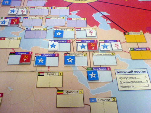 А поле на русском — потому что это самодельный вариант игры. Полтора года назад я перевёл все материалы для Twilight Struggle и выложил их в интернете. Так что если у вас есть немного терпения, вы можете изготовить эту игру самостоятельно.