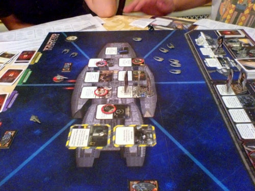 Вторая партия в Battlestar Galactica проходила вшестером. Начальная расстановка и объяснение правил новичкам (их было двое) заняли около 15 минут, а потом мы приступили к игре.
