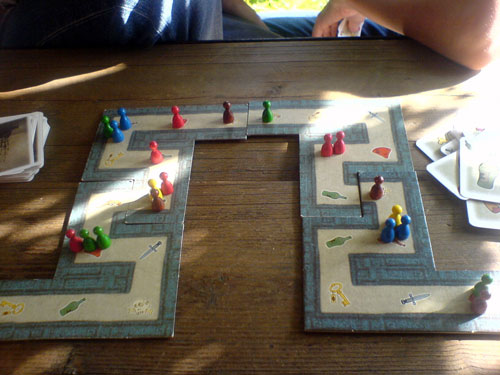 В Cartagena мы сели играть впятером. Все игроки с этой настолкой были знакомы, но мы достаточно давно за неё не садились, так что некоторым пришлось напомнить правила. Игра началась довольно бодро — уже на третьем ходу можно было перескакивать сразу через всё поле в лодку, сыграв "кинжал" или "треуголку".
