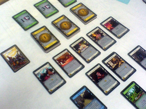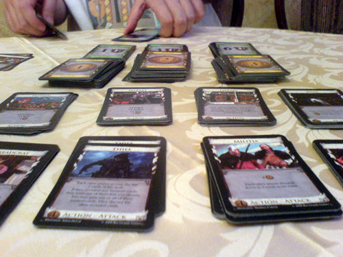 Партия шла быстро, я сразу же начал закупать деньги, потом на них приобрёл себе несколько Workshop’ов и Throne Room’ов, начал класть в колоду "троечки" (золото), а потом — покупать шестиочковые карты победных очков. Их я скупал довольно быстро и не задумываясь приобрёл последнюю, закончив тем самым партию.