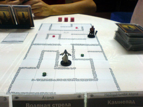 В начале первой партии мы ринулись друг к другу на базы за сокровищами. Моё сокровище уже было в руках у противника, а я уже подходил к чужому, когда вражеский волшебник умело применил карту "Обмен" и поменялся со мною местами. В результате я оказался у себя на базе ни с чем, а противник — у себя на территории с моим сокровищем.