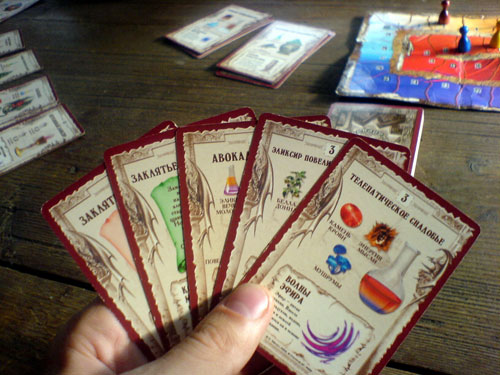 Мне в самом начале игры пришли два закляться (познание и трансформа), но толком использовать их я не сумел. Сначала всё держал в руке, надеясь собрать какой-нибудь дорогой рецепт, но карта всё не шла и не шла. У остальных игроков уже было по 2-3 эликсира, а у меня всё ещё ни одного. Тут уже подошла к концу и колода, а вслед за ней закончились и карты на руках. По итогам партии я занял почётное последнее место.