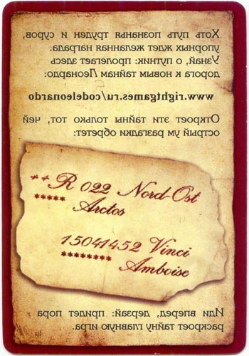 На прошлой неделе я рассказал про закодированное послание, скрытое в коробке с игрой Загадка Леонардо, и, похоже, что кое-какая информация об этом ребусе начинает проясняться. В частности, тов. Hickname в комментариях упомянул о вот такой карте, которая должна входить в игровой комплект: