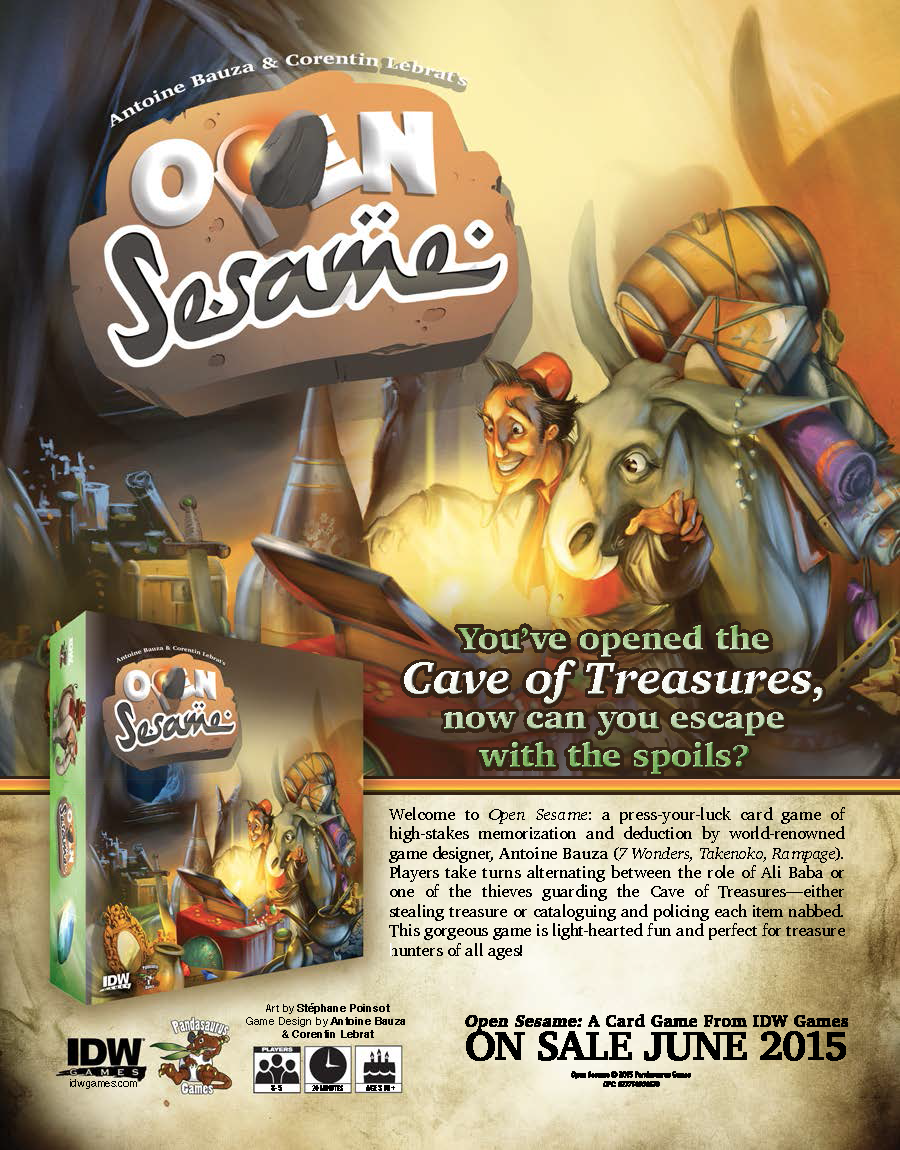 Новая карточная игра от прославленного дизайнера Антуана Боза и издательства IDW появится в продаже этим летом. Это будет игра по мотивам сказки об Али Бабе и сорока разбойниках под названием Open Sesame ("Сезам, откройся!").