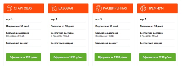 В месячную подписку включено пользование играми в течении 30 дней. Мы бесплатно доставляем и забираем игры, пока только в пределах МКАД в г.Москве. Но уже прорабатываем варианты доставки и забора по центральной части России.