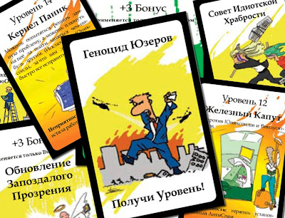 Как так:? Да очень просто — просто кто-то взял карты из Манчкина, перерисовал картинки, переписал тексты на компьютерную тематику и так появилась игра Аутсорсер: