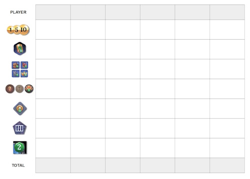 Партия в «Кланк! Катакомбы» всегда завершается подсчётом очков. Вроде ничего сложного, непотраченные золотые монетки идут по номиналу, очки приносят ещё карты из колоды. И некоторые жетоны… Так-то можно вести подсчёты вручную, но тут на Board Game Geek опубликовали неофициальную табличку, маленький листочек, сделанный по образу и подобию блокнотов подсчёта очков, которые встречаются во многих играх.