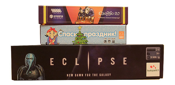 На выходных я принёс с почты три новые игрушки. Две из них в небольших коробках. По возрастанию габаритов это Свинтус 2.0 и Спаси праздник!, а вот третья — нечто среднее между стандартной квадратной коробкой как у Ticket to Ride, 7 Wonders и т.п. и гробом Starcraft. В картонном прямоугольнике габаритами 41х28х9 помещается Eclipse. Возможно лучшая игра про космос 2011 года выпуска. Читать далее