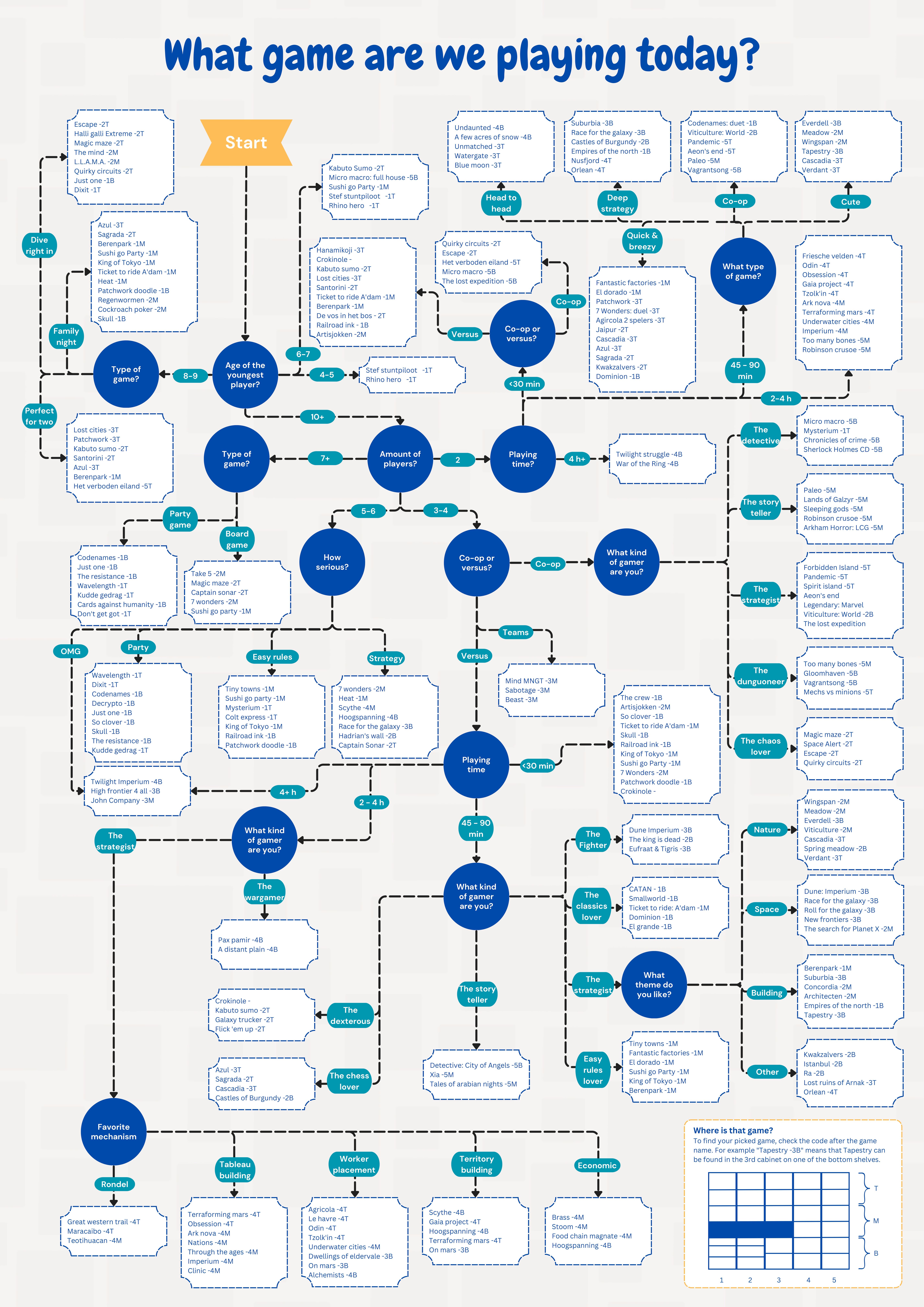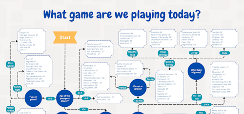 Типичная ситуация: полки забиты коробками, а сыграть не во что. Один из пользователей портала о настольных играх Board Game Geek нашёл решение. Он изобразил целую диаграмму, где отвечая на различные вопросы можно-таки выбрать, во что именно поиграть прямо сейчас.