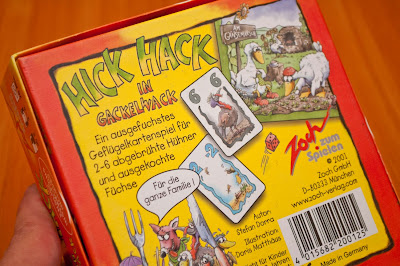 В Северном блоге о настольных играх появилась подборка фотографий игры Hick Hack (нем.), англоязычное издание которой выходило под названием Pick Picnic. Это какая-то карточная игра 2001-го года издания, рассчитанная на 2-6 игроков. Рейтинг на BGG у неё невысок — всего 6.63/10.