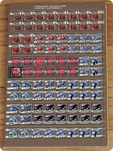 Лист с каунтерами героев и зомби. Как видите, персонажей в игре всего 11, а вот мертвецов — хоть отбавляй. Теоретически их может быть 79 штук. Каунтеры вырублены не до конца, их желательно вырезать канцелярским ножом. В противном случае бумага где-то может отслоиться и у вас появится либо жетон с бахромой, либо жетон, с оборванной по краю печатью.