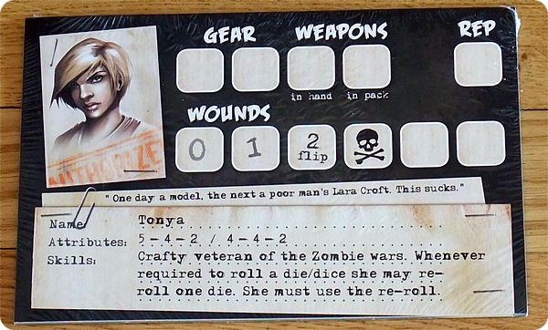 Лист персонажа. Сверху "кармашки" для оружия и предметов, а также счётчик ран. Снизу — параметры героя и его спецсвойство. Например, на фото Тоня может при каждом броске костей перебрасывать один кубик.