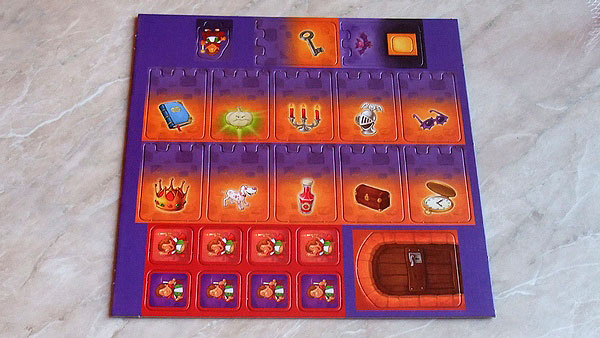А вот как всё это хозяйство выглядит в собранном виде: поле вставлено в коробку. По периметру воткнуты предметы, вдоль краёв марширует Виктор, а игрокам остаётся кидать кубик (ага, "кинь-двинь" во всём его великолепии) и перемещать зеркала, так чтобы в "окно" в одной из стен коробки можно было увидеть отражение любого предмета.