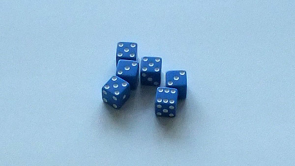 Дайсы очень жестокие. От ровных твёрдых поверхностей они весьма бойко отскакивают совершенно неожиданным образом, будто в них запас упругости больше. Генераторы случайных чисел во всей красе! XD Но вот странное наблюдение. Довелось играть ими в «кости». Старая добрая игра. Шесть костяшек и отлов единиц. Где-то за 30 партий единиц выпало в разы меньше, чем остальных значений! Вопрос к знатокам производства и естествоиспытателям-настольщикам: могут ли быть дайсы отцентрированы в угоду невыпадению определённой грани и как это проверить? Для тех, кто не играл в Карманные сражения, специально оговорюсь: единица — гарантированный промах в этой игре. 🙂
