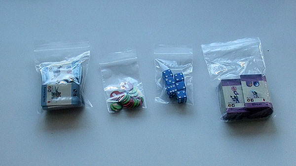 Вот все игровые компоненты в упакованном виде: две армии, пакет с жетонами и ещё один — с кубиками.