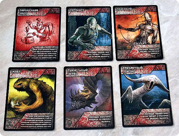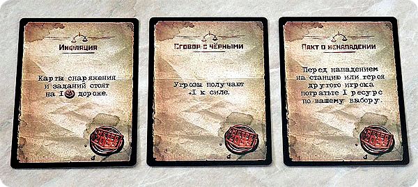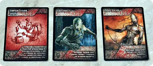 Карты угроз делятся на 2 колоды: угрозы 1 этапа и угрозы 2 этапа (во второй угрозы сильнее, на фото они снизу). Первоначально в игре задействуется первая колода. Как только кто-то набирает 6 победных очков, в игру вступает вторая колода.