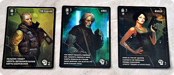 Также в игре присутствуют стартовые карточки фракций. Они двухсторонние. На одной стороне перечислены начальные станции и стартовый бонус фракции.