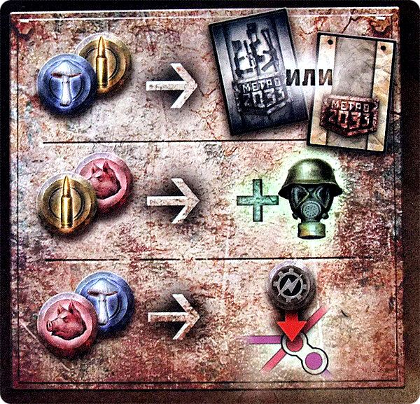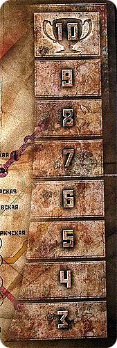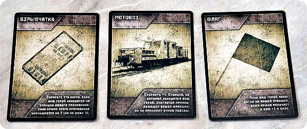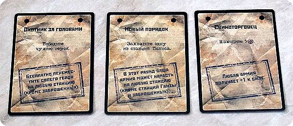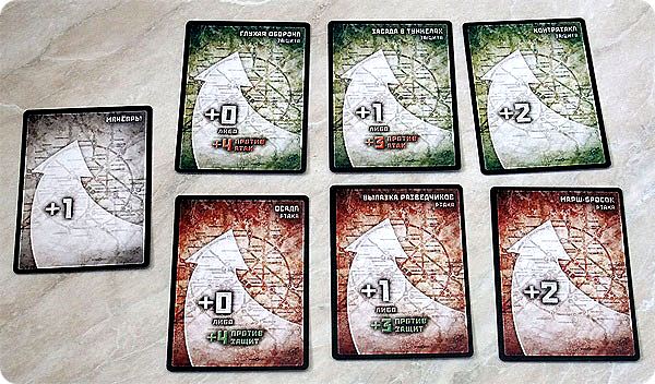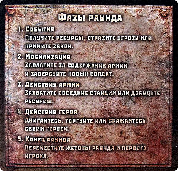 В верхней части поля в углах находятся памятки: сколько стоят карты заданий и снаряжения, что нужно заплатить за увеличение силы армии и что — за захват станций.