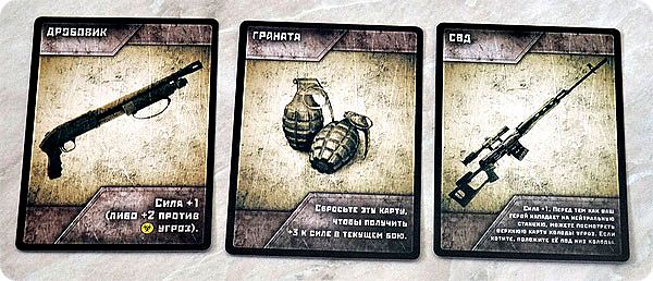 Карты предметов делятся на два типа: снаряжение и оружие. Герои могут носить до 2-х таких карт. На втором этапе игры — до 3-х.