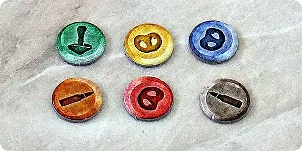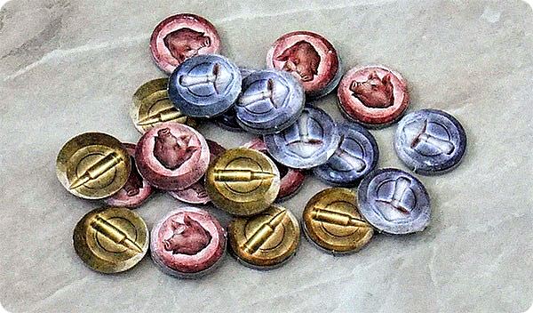 Два жетона: жетон первого игрока (передаётся от игрока к игроку) и жетон раунда действий (двигается по счётчику раундов).