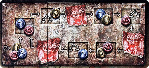 Вверху в середине — счётчик раундов действий. По нему двигается жетон действий, который и определяет что происходит в начале очередного хода: производство ресурсов, принятие законов или отыгрыш угрозы.