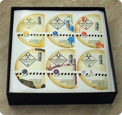Под ним скрывается лист с наклейками для крышек чашек петри. Пять наклеек предназначены для контейнеров с фишками болезней, а шестой — для чашки с фишками игроков и лабораторий.