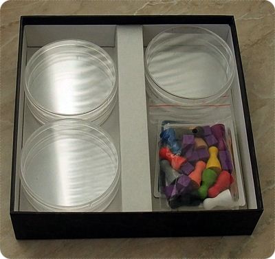 Далее мы видим уже упомянутые чашки петри (шесть штук), занимающие большую часть объёма коробки. В углу приютились пакетик с фишками, а под ним — стопка карт.
