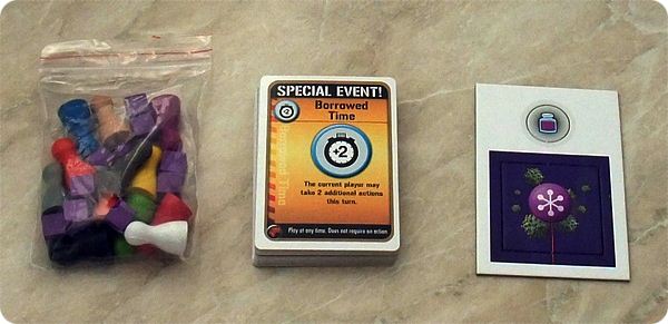 Вот они же, крупным планом: пакет с фишками (разноцветные фишки игроков и фиолетовые кубики новой болезни), колода карт, а также накладка на игровое поле с новой болезнью и жетон лекарства от неё.