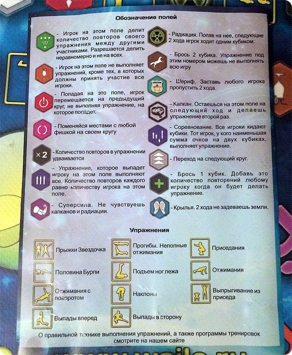 Основная фишка игры — многие клетки завязаны на физические упражнения. Например, попал на приседания, значит, тебе приседать. Бросаешь один кубик, чтобы определить сколько раз, и приседаешь. Попал на отжимания — отжимаешься, и так далее.