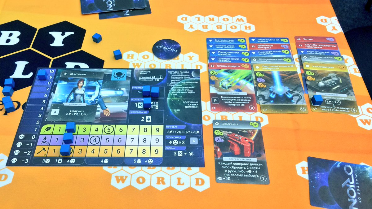 Вернувшись с обеда, мы ощутили себя готовыми к Кеплеру. То есть, простите, Master of Orion, свежему карточному хиту от Hobby World. Когда-то пару лет назад я уже играл в прототип этой настолки, но за давностью времени все забыл, поэтому, осваивал её как в первый раз. По первоначальным ощущениям игра очень похожа на "Поселенцев" пана Тшевичека. Тут тоже можно строить карты, а можно "разорять" их, сбрасывая за ресурсы. Если в "Поселенцах" здания строились в три "линейки", то тут "линеек" четыре. Единственное существенное отличие — в "Поселенцах" у тебя работают активные свойства всех зданий, а тут — только последнего в линейке. А предыдущие только производят ресурсы, превращаясь в некий аналог "сделок" из "Поселенцев". Ну и ещё тут есть три вида ресурсов, только они отмечаются не фишками, а на треках. Партия также длится фиксированное количество ходов, игра идёт на очки, которые начисляются за строительство зданий, за их активацию и за выполнение особых условий.