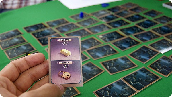 Как только на карте появляется 2 фишки, она переворачивается и игрок, чьи фишки на ней стоят, забирает её себе. Карты приносят золото (суть победные очки), а также опыт (конвертируется в золото по курсу 2 к 1 и обладает каким-то дополнительным свойством).