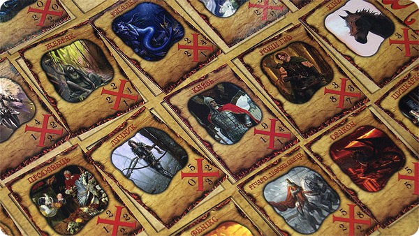 Второй игрой были Свiтанковi Вiхи. Извиняюсь, но официального русского названия автор не упомянул. Примерно это переводится как какие-то там «предрассветные вехи», чтоли. Игра, кстати, полуофициально издана. «Полу» — это потому, что её напечатали в каком-то детском лагере для развлечения детей. Состоит игрушка из поля, разлинованного на клетки (6 х 6) и 36 игровых карт. Каждая карта – это некое существо с цифровыми параметрами. Цифр на каждой карте 4, каждая соотносится с одной из сторон: верх, них, лево, право.