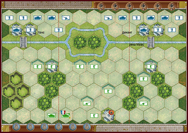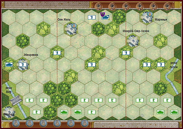 Из трёх сыгранных сценариев мне больше всего понравился именно этот. Тут изначально войска расставлены на достаточно большой дистанции друг от друга, что не позволят одному из игроков с первого хода "давить" противника, как это произошло в "Операции "Кобра" и при "Форсировании Мааса".