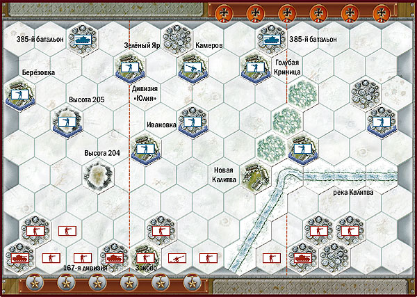 В этом сценарии помимо "правила комиссара" присуютствуют ещё "замёрзшие реки" и "болота". Кроме того, армия немцев, это на самом деле армия итальянцев, которые могут отступать на 1-3 гекса за каждый флаг. Плюс итальянская артиллерия всегда один флаг игнорирует.
