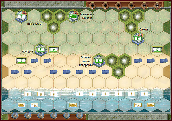 Приняв командование немцами я осознал, что играть за них в этом сценарии не так-то просто. Тут нужно либо наводить через реку понтоны, либо твои войска будут буквально ползти, потому что перед мостами находятся города, в которых юниты должны прекращать движение. В начале я двинул в атаку войска с левого фланга, обстреляв танками окопавшуюся пехоту противника. Мне навстречу устремилась вражеская бронетехника, но несколько моих успешных бросков кубика с ней полностью покончили. Не торопясь переправлять через реку состальные войска, я вволю пострелял из артиллерии, уничтожив один из передовых отрядов противника в центре и основательно потрепав другой. После этого пришла пора атаковать справа. Из-за вражеской гаубицы это было нелегко, но несколько подготовительных шагов, закончившихся розыгрышем карты "Infantry Assault" позволили мне успешно выбить врага из города и вырваться на оперативный простор. Войска оппонента стреляли в ответ и, к сожалению, успели заработать три медали перед тем как я получил шестую. Итоговый счёт оказался зеркальным: 6:3 в мою пользу.