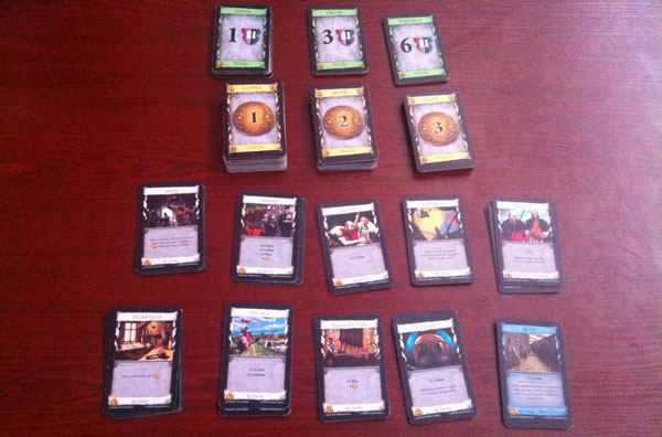Потом мы втроём сели за Dominion. Я объяснил ребятам основы: про карты победных очков, про деньги, за которые они приобретаются и про ход игрока: одну карту сыграть, одну карту купить. Затем мы перешли к изучению десяти карт действий. На стол я выложил ознакомительный набор «First Game», состоящий из Cellar, Market, Militia, Mine, Moat, Remodel, Smithy, Village, Woodcutter и Workshop.