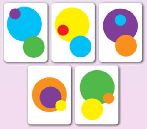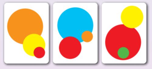 По какому принципу нужно выбирать карты? В Конфетти работает несложное правило: на каждой карточке изображены три разноцветных круга: маленький, средний и большой. Задача игрока — собирать комбинации из трёх карт, чтобы все три круга на них были одного цвета.