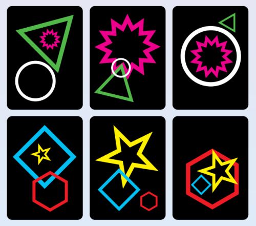 Любопытно, что Конфетти, фактически, предоставляет возможность сыграть в одну и ту же игру двумя наборами карт. Всё дело в том, что традиционных рубашек здесь нет. На обороте всех карт изображены разноцветные геометрические фигуры на чёрном фоне. Так что можно просто перевернуть все карты на обратную сторону и играть в Конфетти, собирая формы одного и того же цвета.