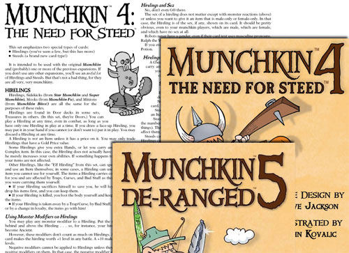 Читатель по имени Alex K aka Zenerv прислал мне ссылку на собственный перевод правил 4-й и 5-й частей Манчкина. Правила занимают всего 1 лист формата А4 и состоят из двух разделов: наёмники и коняги.