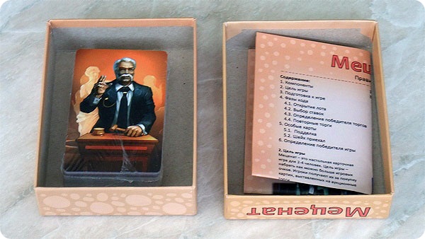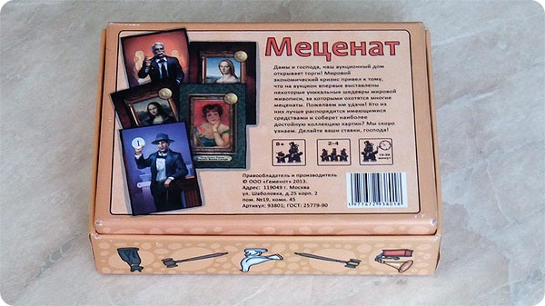 Меценат, как и другая игра Геменота — Купи слона! — упакована в очень небольшую коробку. Её габариты крайне невелики, она лишь чуть выше обычной игральной карты.