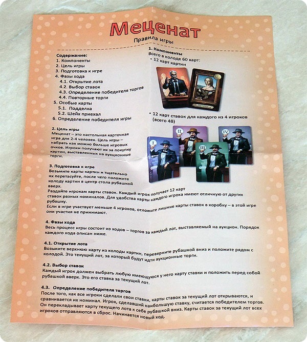 Предлагаю ознакомиться с фотографиями компонентов настолки Меценат, игры которую я привёз с Тишинки. Выпущена она студией Геменот, рассчитана на 2-4 игроков и состоит только из карт.