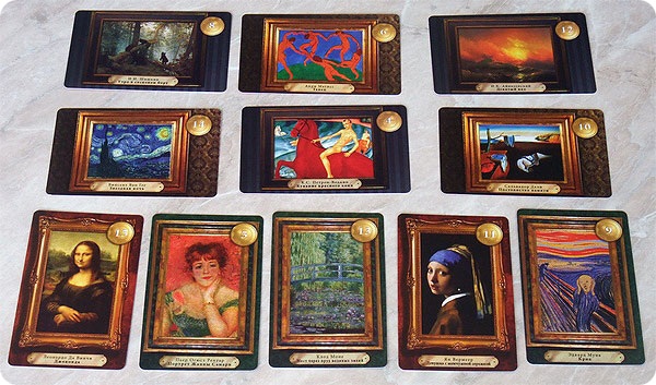 В колоде картин или лотов присутствуют известные изображения, в частности "Купание красного коня", "Девятый вал", "Мишка на севере", "Мона Лиза" и др.