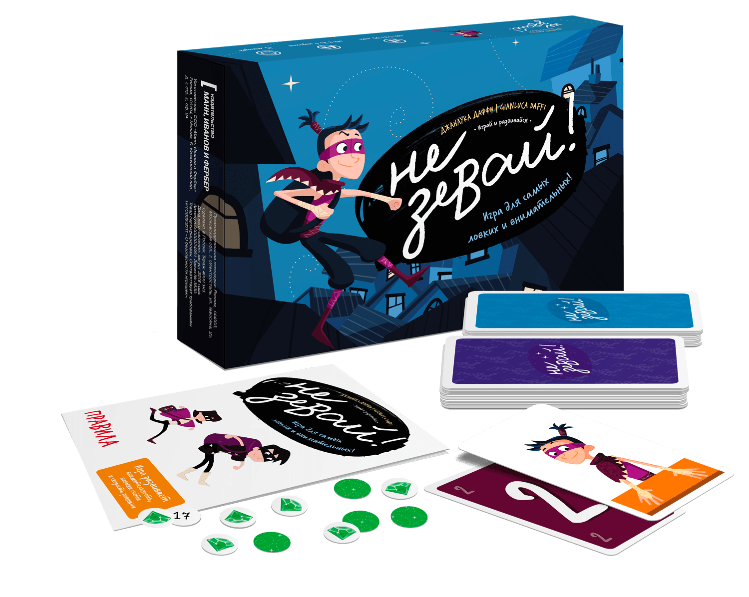 Не зевай!Соберись и сосредоточься! Перед тобой весёлая игра на скорость реакции и внимательность. Правила простые: переверни две карты и быстрее соперника хлопни нужное количество раз по столу, перед собой или над головой. Опереди соседа и забирай у него изумруды! Победит самый богатый игрок! Будь на чеку, не зевай!