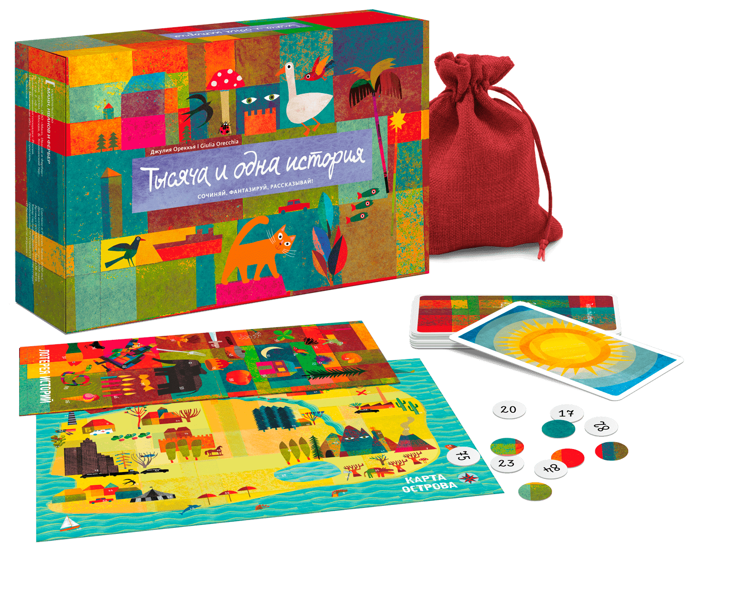 Тысяча и одна историяКрасивая семейная настольная игра по сторителлингу. Развивает языковые и нарративные навыки, воображение и креативность. Можно составлять комбинации элементов, заставляя, например, пиратов путешествовать на Луну на космической ракете, чтобы съесть пиццу.