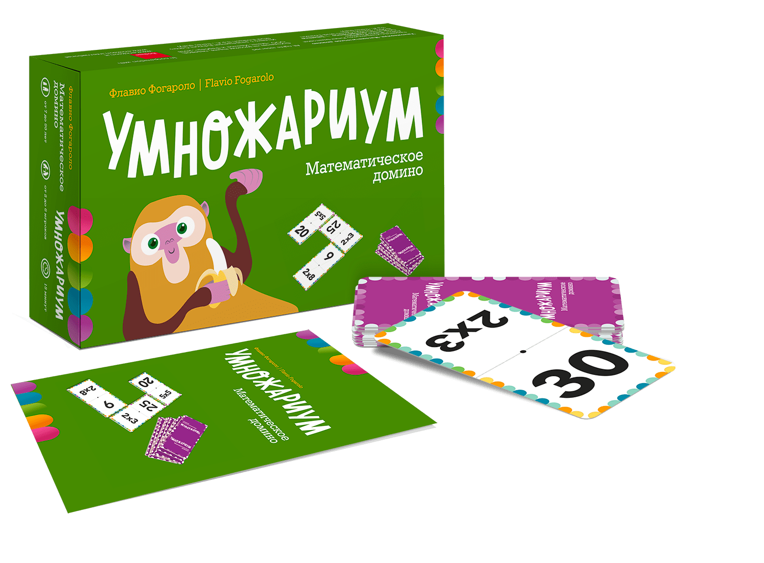 УмножариумЭто домино создано специально для легкого и увлекательного изучения таблицы умножения детьми: вместо традиционных точек на каждой карточке нанесены математические примеры и цифры. Совмещая клетку с примером (например, 5?8) и результат умножения (40), ребенок сразу видит, правильно ли он посчитал пример, благодаря цветовому паттерну, который должен совпасть на двух клетках.