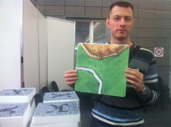 После моего выступления на очереди доклад Ивана Туловского об издании цифровых версий настольных игр. Но до выступления есть ещё время. Иду к сцене, там начинается установка рекорда по игре в самый большой экземпляр Каркассона. В стороне сложены здоровенные тайлы с огромными миплами. Игроки выкладывают и выставляют их прямо на сцену, где формируется гигантское игровое поле.