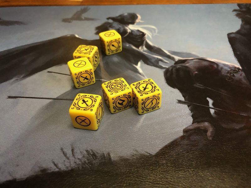Максимальным составом — впятером — в «Хоббит»: такой толпой очень важно иметь высокие показатели «инициативы» (зелёный кубик), чтобы в первых рядах проходить испытания (отстающие будут кидать кубики за кристаллы 1-2 раза, а лидеры — 2-3 раза). На первых испытаниях мы с младшим оступились и так и не успели догнать лидеров до конца партии. Лидеры шли плотной группой, и победитель определился буквально на последнем испытании: