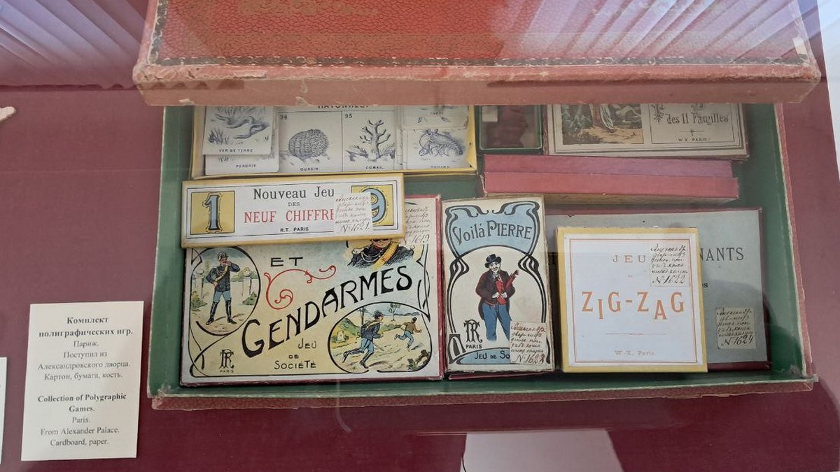 Как указано на стенде, перед нами комплект «полиграфических игр». Произведены в Париже и поступили в музей из Александровского дворца. Считай, настолки из царской коллекции! Состав: картон, бумага, кость (видимо имеется в виду игральная кость, то есть кубик).