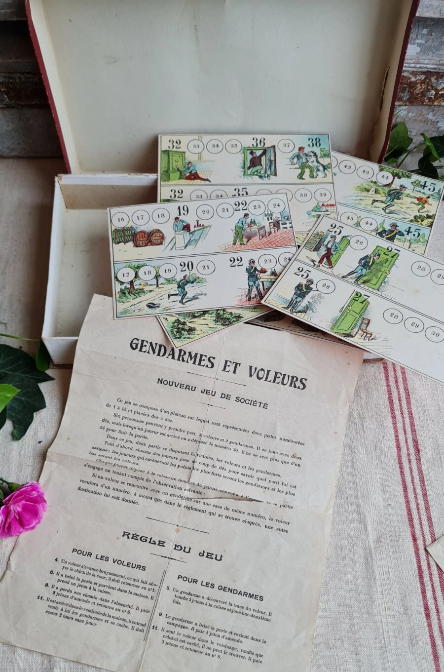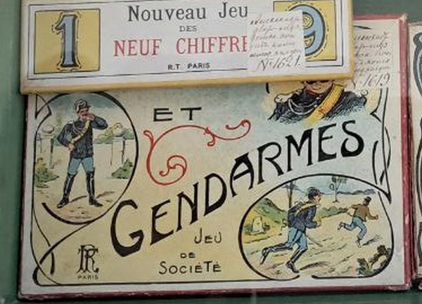 На фото видно сразу несколько коробок. Это Nouveau Jeu des Neuf Chiffre, Vouleurs et Gendarmes, Voila Pierre и Jeu Zig-Zag. В кадре есть ещё пара коробочек, но названия на них, увы, не разобрать.